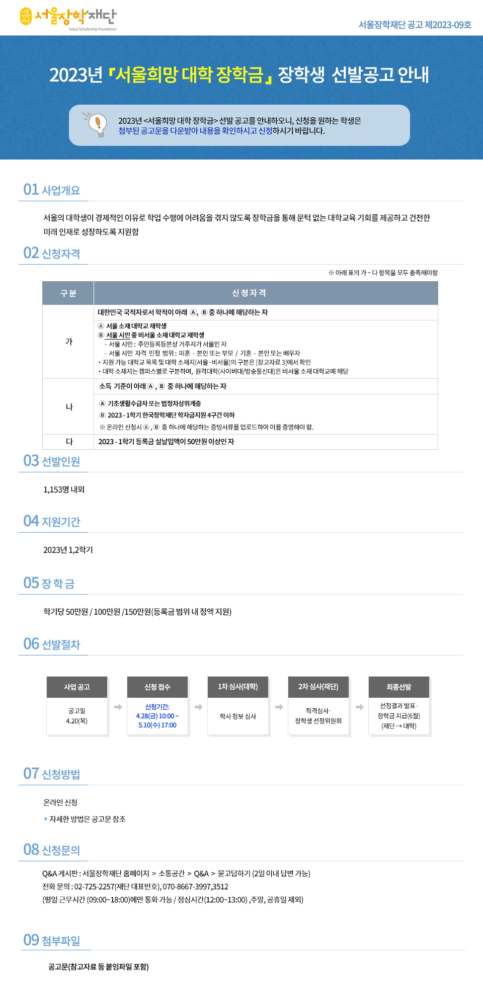 2023년 서울희망 대학 장학금 장학생 모집 안내