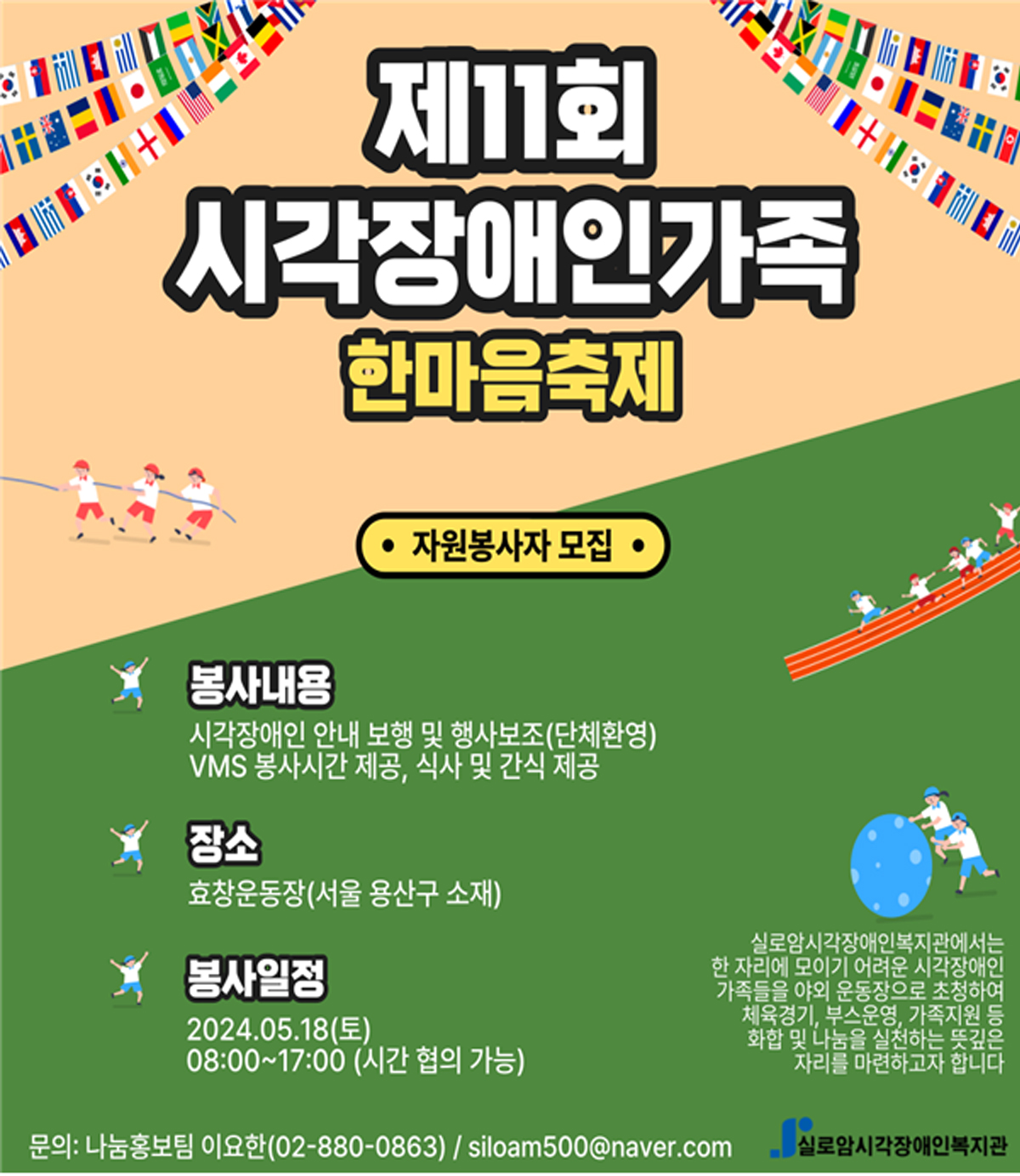 실로암시각장애인복지관에서는 시각장애인가족들을 야외 운동장으로 초청하여 체육경기 및 체험부스 운영, 가족지원 등 화합 및 나눔을 실천하는 시각장애인가족 한마음축제행사를 진행합니다. 시각장애인가족들을 위한 행사에 함께 해주실 자원봉사자분들을 모집합니다.
