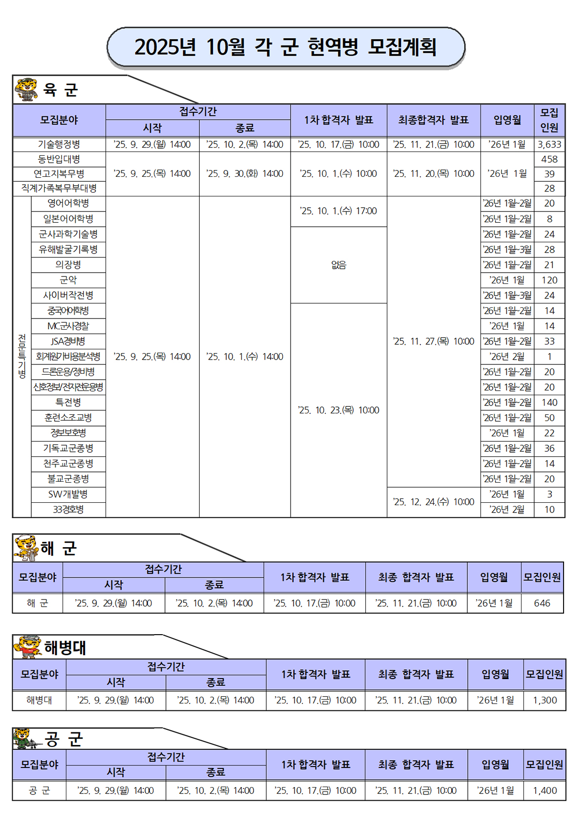 [홍보] 2025년 10월 각 군 현역병 모집계획