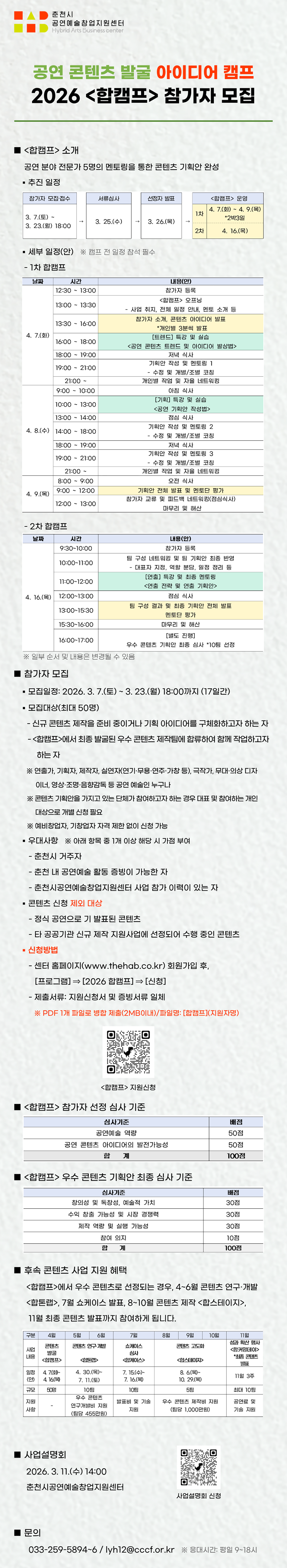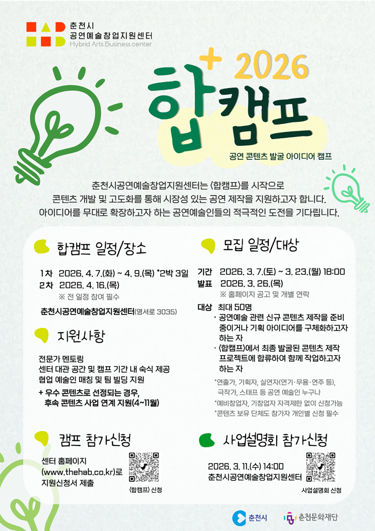 [홍보] 춘천시공연예술창업지원센터 2026 공연 콘텐츠 발굴 사업[합캠프] 참가 모집
